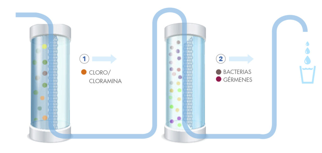 Mediante un filtro Carbon Block se elimina todo tipo de impurezas o turbiez del agua, en una segunda fase del proceso, la ultrafiltración elimina sustancias orgánicas y evita la retrocontaminación.